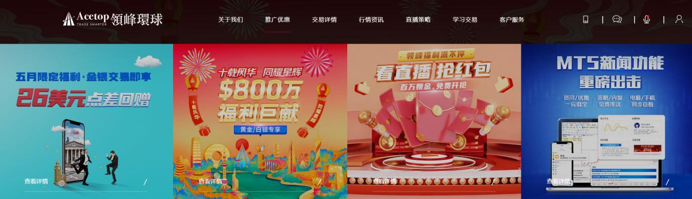 黄金投资者透过官网,即可详细查看平台的各类不同的优惠活动。毕竟投资需要考虑成本问题。从官网可知,该平台持续推出各式各样的优惠活动,譬如领峰十周年庆$800万福利巨献、积分好礼大派兑、看直播抢红包等等,相比之下,所需投资成本比其他平台更低。