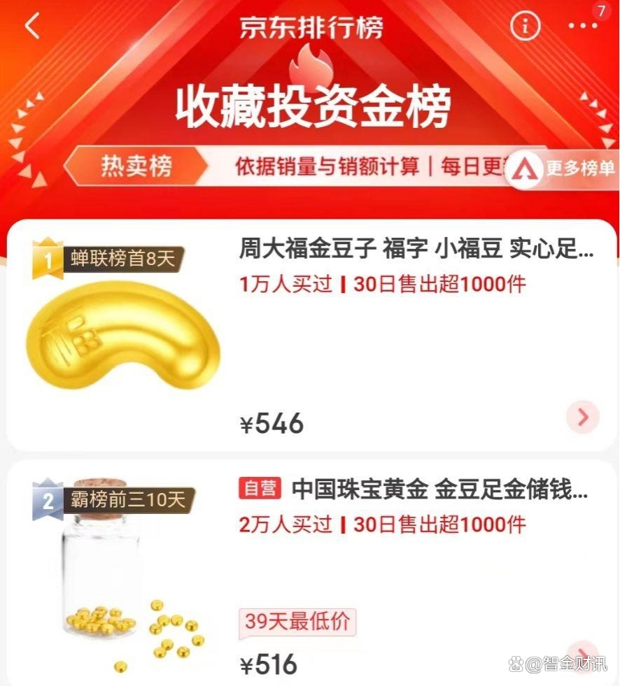 不知从何开始,“攒金豆”在年轻人群体中风靡,“攒钱不如攒金豆”、“小金豆YYDS,已N次回购”、“人生第一桶金,实名推荐小金豆”等言论频繁出现网络;而在此之前,黄金还一度因款式土、样式丑、暴发户专属等标签,劝退很多人,但现在,买金正成为一股新风潮。电商平台、网络直播间,各式小金豆让人眼花缭乱,相关产品留言区10万+评论比比皆是,而在京东“收藏投资金榜”上,小金豆更是名列前茅,遥遥领先其他黄金产品。